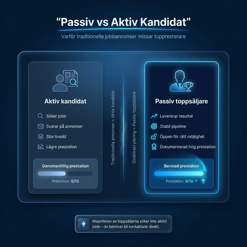 Gamla metoder bygger på annonser och utdragen search, vilket leder till långa ledtider och fel kandidater i pipelinen. Jobbannonser attraherar aktivt arbetssökande, inte toppresterande säljare.